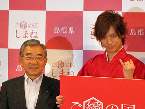 「ウィッシュ」の進化版?!「ご縁ッシュ」のポーズをとるDAIGO(右)と溝口島根県知事