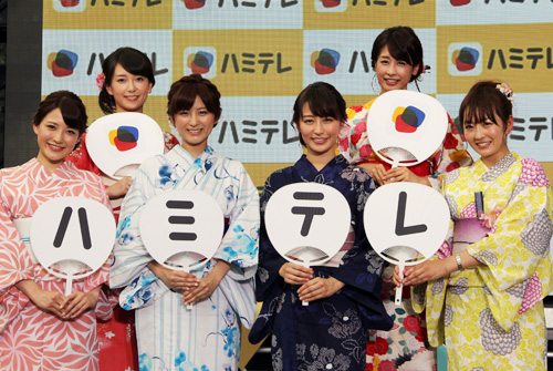 NHKの和久田麻由子アナウンサー(25)、日本テレビの小熊美香アナウンサー(28)、テレビ朝日の宇賀なつみアナウンサー(28)、TBSの枡田絵理奈アナウンサー(28)、テレビ東京の狩野恵里アナウンサー(27)といった各局の人気女子アナと浴衣姿でアプリのPR。各局で流れるCMでのウィンクに思わず赤面した。