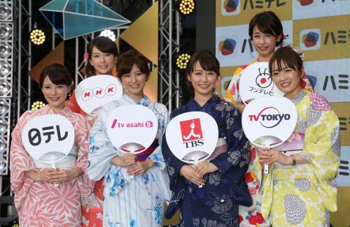 NHKと在京民放5社が共同開発したスマートフォン向けアプリ「ハミテレ」のリニューアル会見が6日、都内で行われ、各局の女性アナウンサーが浴衣姿で登場した。