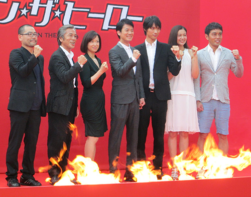 特撮映画などに欠かせないスーツアクターに光を当てた。唐沢は「情熱たっぷりの作品。人間ドラマも見どころだし、期待して」と自信たっぷり。ラストシーンで火だるまになるのにちなんで、写真撮影も炎に包まれて実施。トーチを持った唐沢は装置に点火すると、「あづい!」とビックリ。熱風を浴びた寺島進(50)は「消してくれ~!」と絶叫した。