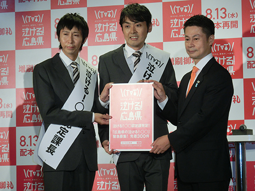 さらに県の泣ける魅力を発掘する「泣ける!○○認定課」の発足を発表。初代課長には地元出身のお笑いコンビ・アンガールズが就任した。2人はさっそくタレントのギャル曽根(28)ややしろ優(27)らと地元名物の汁なし担担麺、うずみごはん、比婆牛ステーキなどを試食してアピール。田中卓志(38)は「広島には泣けるスポットや食べものが本当にあります。夏休みを利用してぜひ遊びに来てください!」と声を張り上げていた。