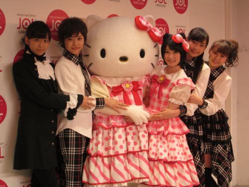 ハローキティとともに主演ミュージカルの制作発表を行ったJuice=Juice(左から)宮崎由加、金澤朋子、宮本佳林、植村あかり、高木紗友希