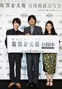 会見で笑顔をみせる(左から)藤原紀香、小池徹平、筧利夫
