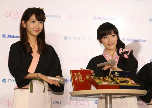 発売されるおせちを披露するAKB48・柏木由紀(左)と渡辺麻友