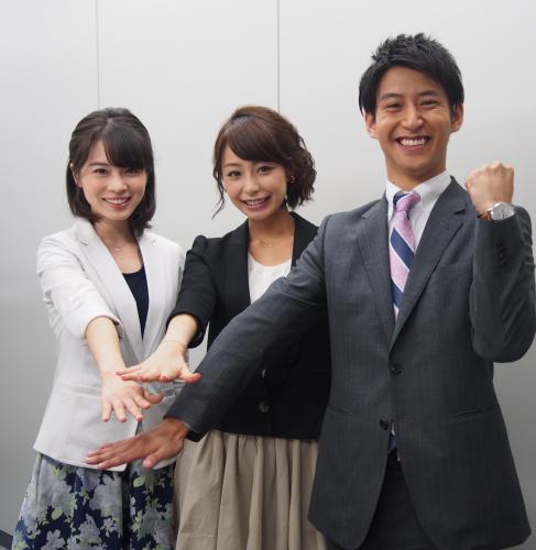 6日からTBS「あさチャン!」と「Nスタ」の朝と夕方の看板番組でレギュラーデビューを果たす左から皆川玲奈、宇垣美里、品田亮太の新人3人のアナウンサー