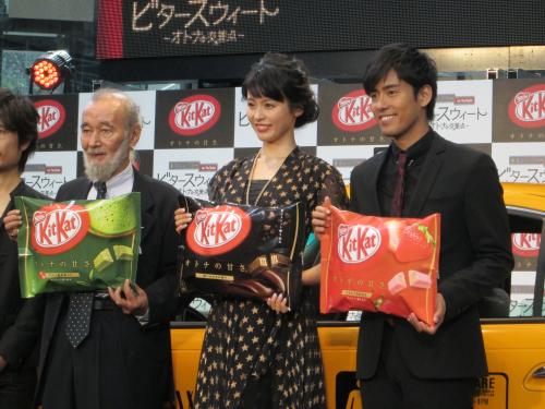 キットカットのイベントに登場した(左から)ミッキー・カーチス、本仮屋ユイカ、K。