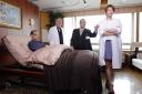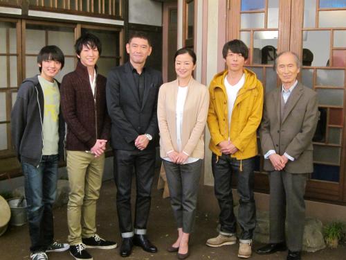 NHKBSプレミアムのドラマ「だから荒野」の会見を行った(左から)濱田龍臣、前田公輝、杉本哲太、鈴木京香、高橋一生、品川徹