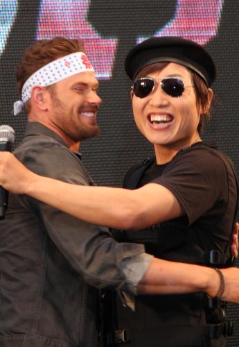 来日できなかった主演のシルベスター・スタローン(68)に代わり、“実践型のゲスト”として迷彩服にサングラス姿で登壇したしずちゃんは「静代スタローンです」とニッコリ。「(映画は)すっごい格好良かった。アクションシーンもすごくて、私も10年後ぐらいに出させてもらえるように鍛えたい」とパトリック・ヒューズ監督に熱烈ラブコールを送ると、監督からは「もちろん!『エクスペンダブルズ4』に出てほしいぐらい」。これには「ちょっと考えてみようかな。4に出たい」とやる気をみなぎらせた。