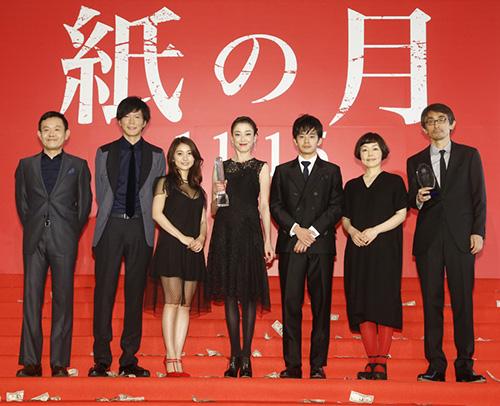 「紙の月」試写会に参加した(左から)近藤芳正、田辺誠一、大島優子、宮沢りえ、池松壮亮、小林聡美、吉田大八監督