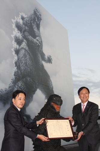スタジオ内のゴジラ壁画前で開かれた表彰式で、おなじみのテーマ曲とともにゴジラの着ぐるみが登場。保坂展人区長が表彰状を読み上げた。ゴジラシリーズは1954年11月の初公開以来30作品を数え、うち第1作を含む28作品が東宝スタジオで作られた。