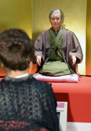 高島屋大阪店(大阪市中央区)の1階イベントスペースに5日、人間国宝の落語家桂米朝にそっくりなロボットが登場した。来店客の人生相談などに応じ、さながら米朝と会話している雰囲気を楽しめる。展示は11日まで。