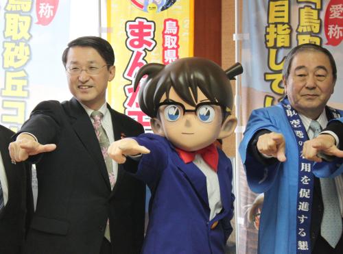 平井知事は「海外でも大人気の作品。“真実はいつもひとつ。鳥取は良いところだ”と宣伝していけたら」と、決めぜりふを引用して愛称決定を歓迎。「コナン空港にコナンかい(来ないかい)?」とPRした。