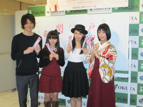 筆ペン「ふで和み」シリーズの発売イベントを開いた書道家の涼風花さん(右端)。ペン字講習を受けた、左から、犬飼貴丈、関りおん、戸田れい