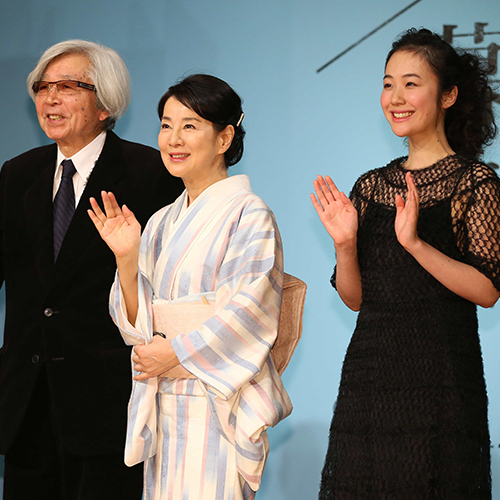 壇上で笑顔を見せる(左から)山田洋次監督、吉永小百合、黒木華