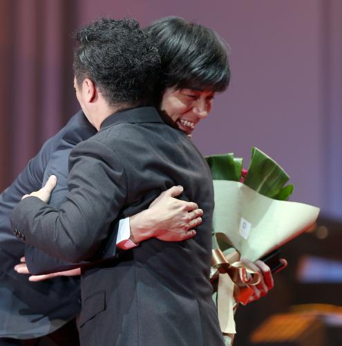 石原裕次郎新人賞を受賞した東出昌大(奥)は、やべきょうすけに花束を手渡されハグする