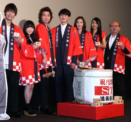 映画「ST 赤と黒の捜査ファイル」初日舞台あいさつを行った(左から)窪田正孝、志田未来、藤原竜也、岡田将生、瀬戸朝香、芦名星、佐藤東弥監督