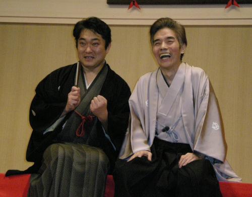 「三代目林家菊丸襲名披露公演」の発表会見に出席した林家菊丸(左)と林家染丸