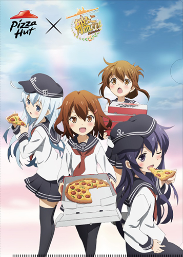 キャンペーンは艦娘たちの協力のもと、ピザハットの「おいしさ、もっと!」を補給し「明日も元気に頑張ろう!」という提督への応援が目的。期間中にMサイズのピザを注文して「艦これ特典」と希望すると、第六駆逐隊の暁・響・雷・電の4人がピザをほおばる描き下ろしイラストを使用した特製ピザスリーブと、特製クリアファイルを先着でプレゼントする。