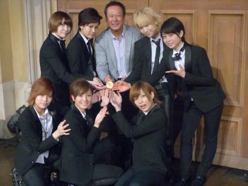 デビュー曲発売記念イベントを行い、応援に駆けつけた森末慎二氏(後列中央)の金メダルを手にする「THE HOOPERS」