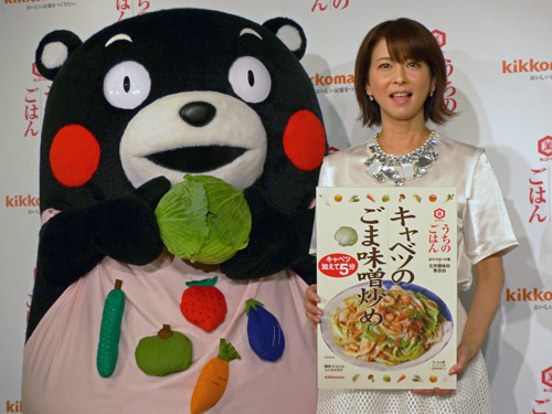 キッコーマン「うちのごはん おそうざいの素」の新CM発表会に出席した森高千里とくまモン