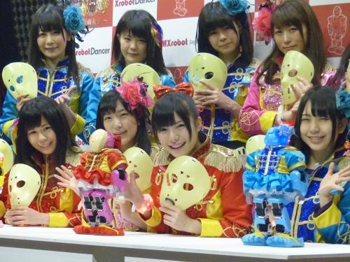 マスク姿の異色アイドル「仮面女子」が16日、都内で行われたBMXrobot Japan社の新作ダンシングロボットの発表会に出席した。