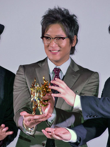 フィギュアを手にアニメ「聖闘士星矢」の発表会見に登場した細川茂樹