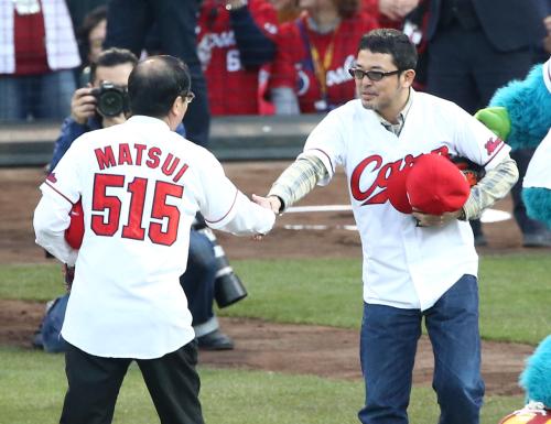 広島―ヤクルト戦の始球式で捕手を務めた奥田民生(右)
