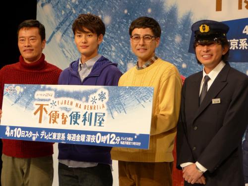 北海道の田舎町にある便利屋を舞台にした物語。真冬の北海道ロケで、共演の鈴木浩介(40)、遠藤憲一(53)とすっかり打ち解けたという岡田は「僕のツッコミが毎日洗練されていって、自分の中で、いいツッコミと悪いツッコミが分かってきた」と話した。遠藤は「新しい岡田君を楽しめる作品」とアピールした。