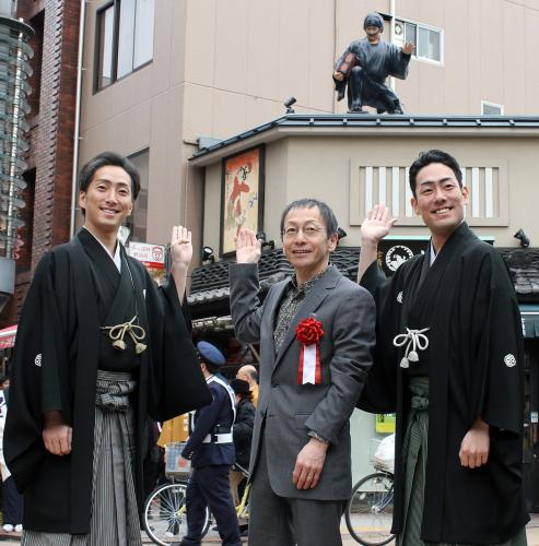一方、鼠小僧は「野田版 鼠小僧」の勘三郎さんをデザインし、浅草公会堂の入り口を見下ろすように鎮座。演出の野田秀樹氏(59)も飛び入りし、「こんな所に乗っけられて、何だよって怒っているかもしれないけれど、本当に幸せなヤツだね」と笑顔で話した。