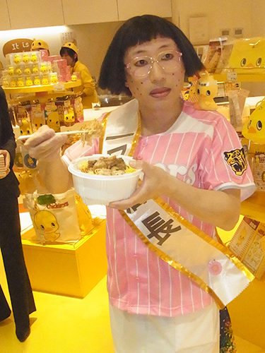同社で開催中の「GO!GO!阪神タイガースキャンペーン」のテレビCMにも、新喜劇でブレーク中の女装キャラ「すち子」としてキャビンアテンダント(CA)姿で出演中。この日もチキンラーメンのシンボルキャラクター「ひよこちゃん」にちなんだ背番号「145」が入ったピンクのユニホームを着用して登場。「ご飯の中にチキンラーメンが入っておいしい」というチキ弁や、チキンラーメンソフトをPRするなどノリノリで、接客やレジ打ちにも挑戦した。