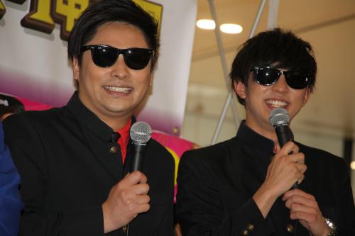 お笑いコンビ「8・6秒バズーカー」が14日、千葉幕張で「ハイスクールマンザイ2015 H―1甲子園」の開催発表会見に出席。学ラン姿で登場し、前年の高校生チャンピオン「いなかのくるま」と漫才対決を行った。