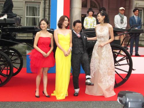馬車に乗って登場した(左から)安達祐実、田中麗奈、水谷豊、吹石一恵