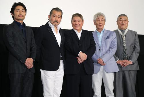 北野武監督(68)の3年ぶりの新作映画「龍三と七人の子分たち」が25日に初日を迎え、北野監督、主演の藤竜也(73)らが都内で舞台あいさつした。