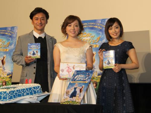 「サウンド・オブ・ミュージック 製作50周年記念 吹き替え版」リリース記念舞台あいさつに出席した(左から)石丸幹二、平原綾香、日笠陽子