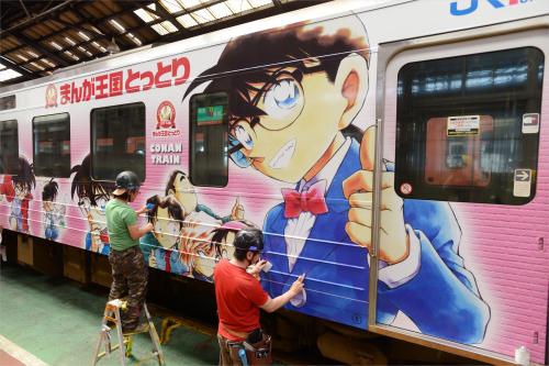 漫画やアニメで人気の「名探偵コナン」のキャラクターを列車に描く「コナン列車」のラッピング作業が26日、JR西日本米子支社の後藤総合車両所(鳥取県米子市)で行われた。