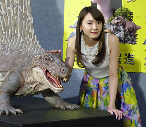 NHKスペシャル「生命大躍進」取材会に出席した新垣結衣。古代生物「ディメトロドン」の模型の頭をなでる