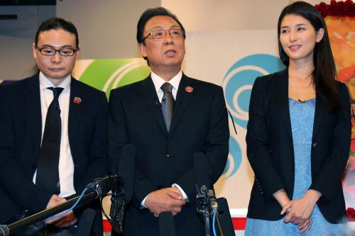 TOKYO MX「バラいろダンディ」放送終了後に会見した出演陣の(左から)苫米地英人氏、梅沢富美男、橋本マナミ