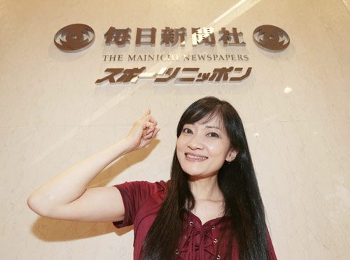 スポニチのロゴの前でポーズをとる島田歌穂