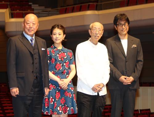 音楽劇「青い種子は太陽のなかにある」製作発表に出席した(左から)六平直政、高畑充希、蜷川幸雄氏、松任谷正隆氏