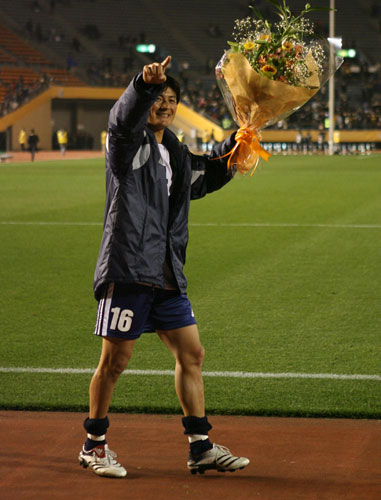 花束を手に声援に応える岩本輝雄。06年12月撮影