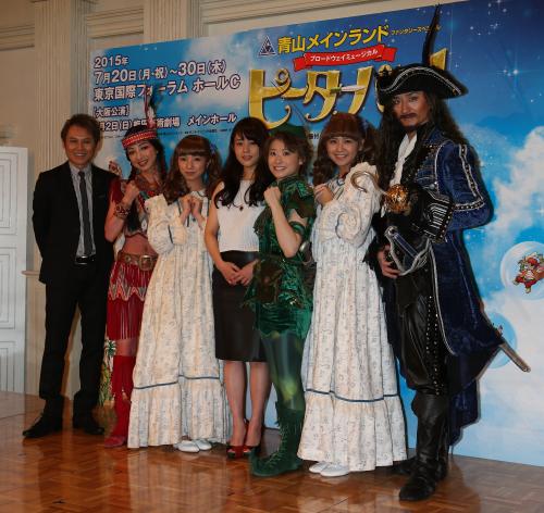 「ピーターパン」製作発表フォトセッションでポーズをとる(左から)演出・振付・上演台本を担当した玉野和紀氏、白羽ゆり、入来茉里、8代目ピーターパンを務めた高畑充希、9代目ピーターパンの唯月ふうか、佐藤すみれ、大貫勇輔