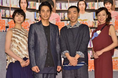 NHKBSプレミアム「本棚食堂」の第1話完成試写会に出席した(左から)山下リオ、中村蒼、柄本時生、遊井亮子