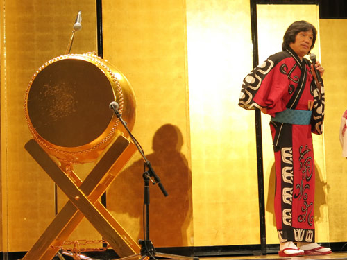 金箔張りの和太鼓の演奏をバックに、熱唱する河内家菊水丸