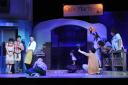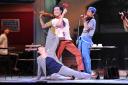 七夕飾りを前にジャンプする「スー女タレント」山根千佳