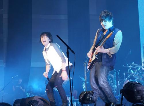 3度目の台湾公演を台北市の台湾国際会議センターで行ったflumpool。ボーカル山村隆太(左)とギターの阪井一生
