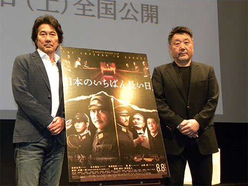 前日までの雨から一転、晴天となり「晴れ男の役所です」とあいさつ。大阪ではタコ焼きやイカ焼きの差し入れ攻撃を受け「もう粉だらけ」と言って、笑わせた。太平洋戦争末期を描く同作で陸軍大臣を熱演。「終戦70年、今後も平和に暮らすためにどうすべきか本作を機に議論されれば」と語った。原田眞人監督(66)は「戦争は起こると終結させるのがいかに困難かが本作で分かる。危険な道を歩みつつある今の日本で、若者や多くの世代に見てもらいたい」と訴えた。