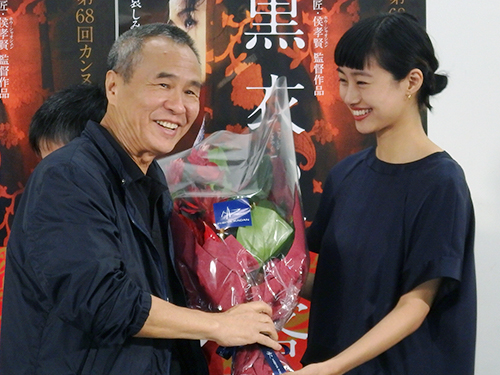 映画「黒衣の刺客」の会見で、ホウ・シャオシェン監督に花束を渡す忽那汐里