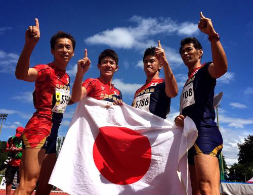 フランス・リヨンで行われた世界マスターズ陸上の4×100メートルリレーで金メダルを獲得し、笑顔で日の丸を掲げる武井壮(右) 武井壮 世界マスターズ陸上で金メダル「人生の大きな支えに」 ギャラリーで見る この記事のフォト 2015年08月17日の画像一覧 もっと見る 2015年08月17日の画像をもっと見る