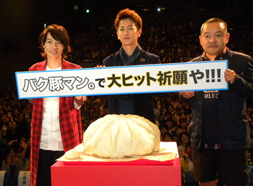 タイトルにちなみ、ステージに大阪名物「551蓬莱の豚まん」の100個分に当たる巨大な“バク豚マン。”が登場。直径50センチ、高さ20センチ、重さ50キロの大迫力に、「スゲェ!マジか!」と驚くダブル主演の神木隆之介(22)の横で、佐藤も笑顔で見入った。「さっき休憩のときに(普通サイズを)食べましたよ」と目を丸くし、「大阪来て良かったッス」と感激していた。