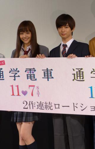 ヒロイン役の松井愛莉(18)とともに、劇中の高校生役の制服姿で登場。同じ通学電車に乗る男女に突然起こった不思議な出来事を描く恋愛作品。千葉は「きょう、こっちで寝てもいい?」と胸キュンのセリフを生披露して、女性客をメロメロにした。シリーズ作「通学途中」(同21日公開)に出演した中川大志(17)、森川葵(20)も登壇した。